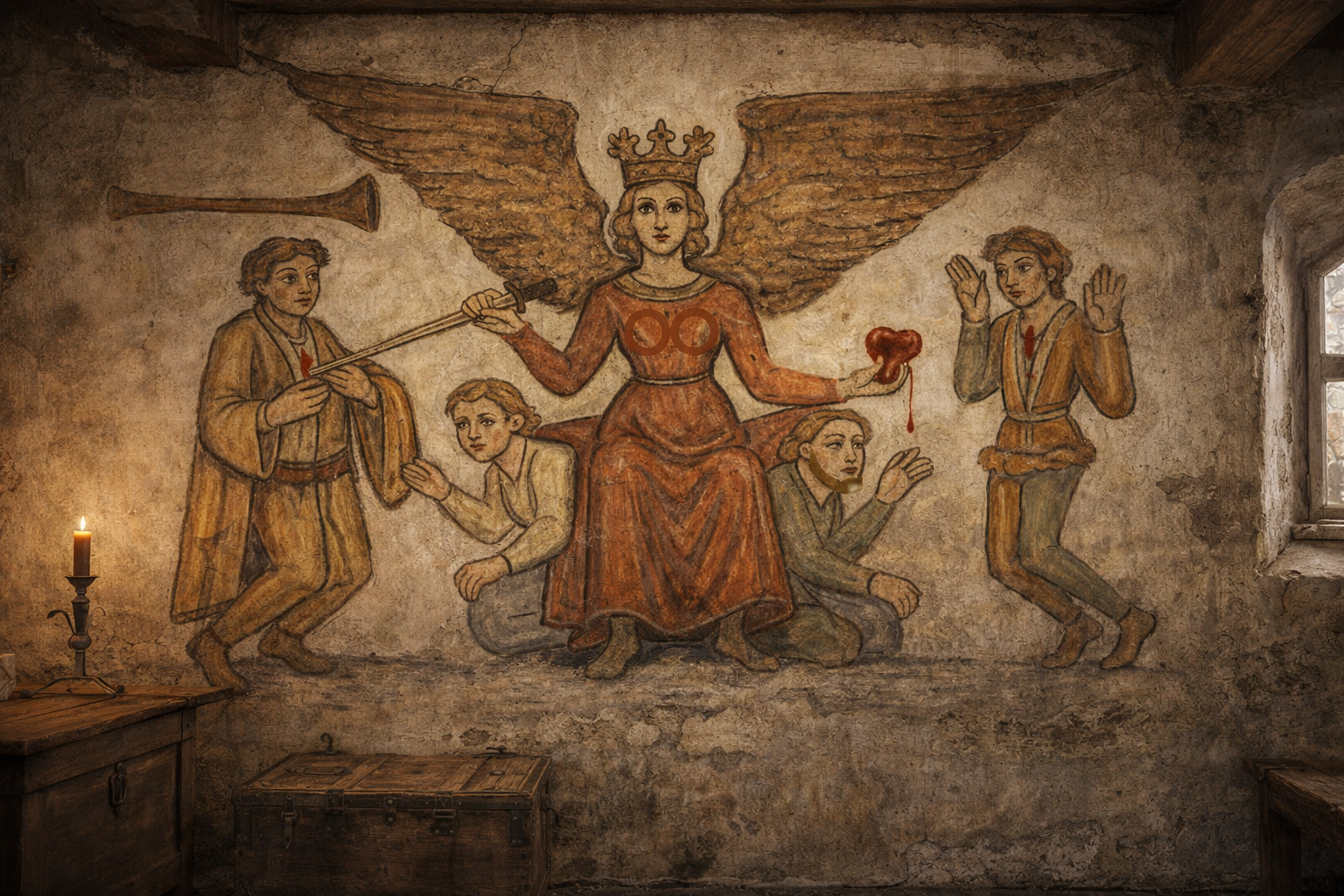 A rare allegorical painting of ca. 1400 (see figure 1), discovered in a guild house in Zurich in 2009 shows Frau Minne presiding over the suffering of male lovers who are having their hearts torn from their breasts. In this cruel scene Goddess Minne, the mistress of love, sits on a throne consisting of two men. She has just torn out the heart of a man to her left which she holds in her hand, while she is already cutting open the chest of another man to her right to rip his heart out.1